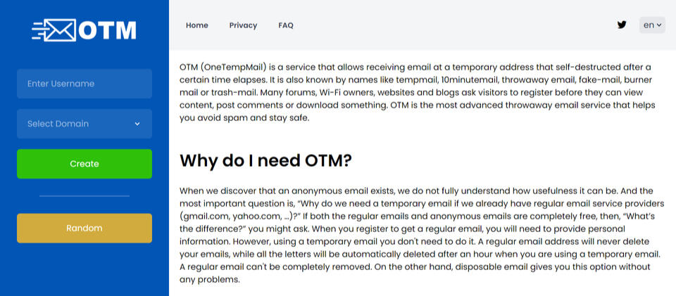OTM (OneTempMail) is a service that allows receiving email at a temporary address that self-destructed after a certain time elapses.